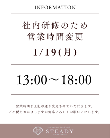 1/19(月)は、社内研修のため営業時間を13:00〜18:00とさせていただきます。